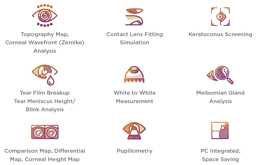 Izpis podatkov roženice, izpis primerjave podatkov, kontaktne leče, izpis elevacij roženice, analiza Zernike, pupilometrija, izračun toričnih IOL leč, posnetek zaslona, NIBUT, analiza meibomskih žlez, TMH, Fluorescein |