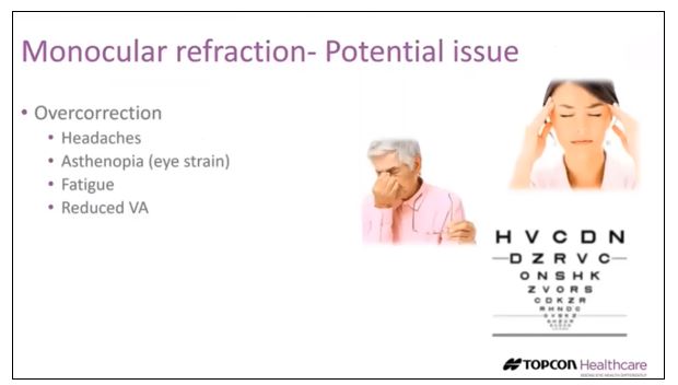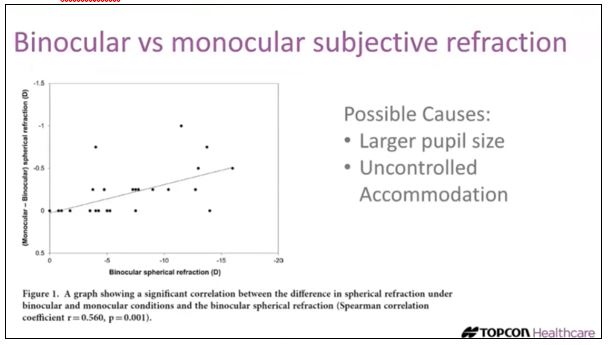 Kadar izvajamo refrakcijo desnega očesa pa levo oko vidi le prazno sliko vendar obrobljena črna črta še vedno ostaja vidna. To je „binokularno zaklepanje“ in to nam omogoča vzdrževanje fuzije in nam pomaga kontrolirati akomodacijo.