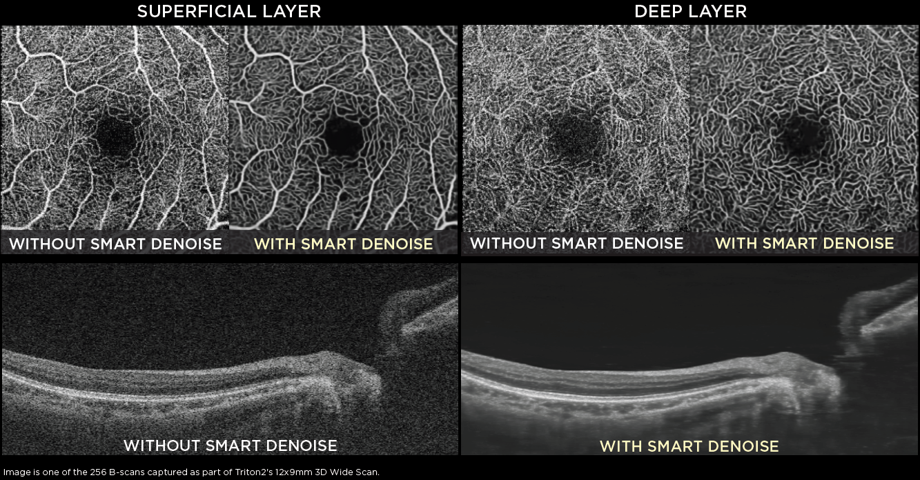 ✔ Smart Denoise*² zagotavlja višje razmerje med signalom in šumom pri 3D OCT in