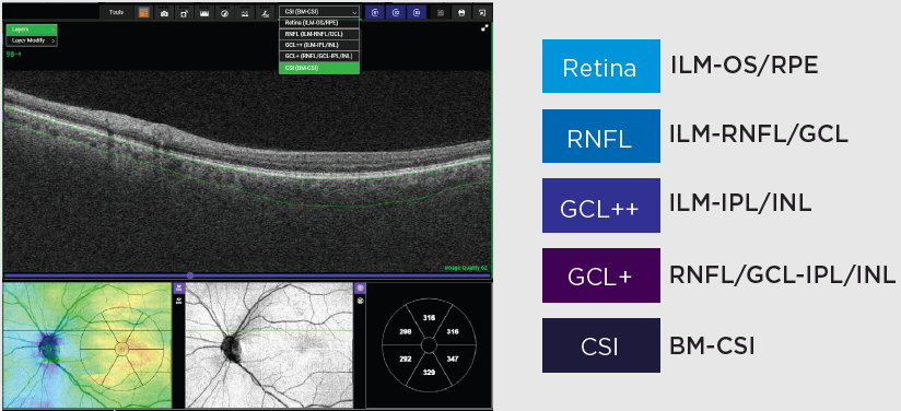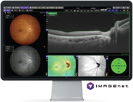IMAGEnet7 omogoča do 5 zemljevidov debeline mrežnice, kar omogoča kvantifikacijo mrežnične plasti in podplasti.