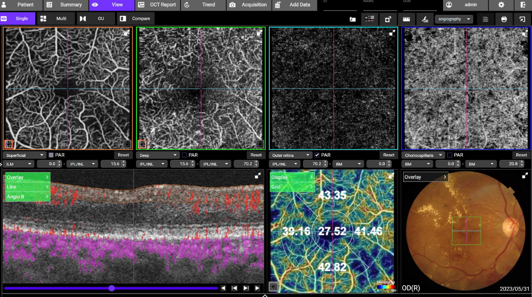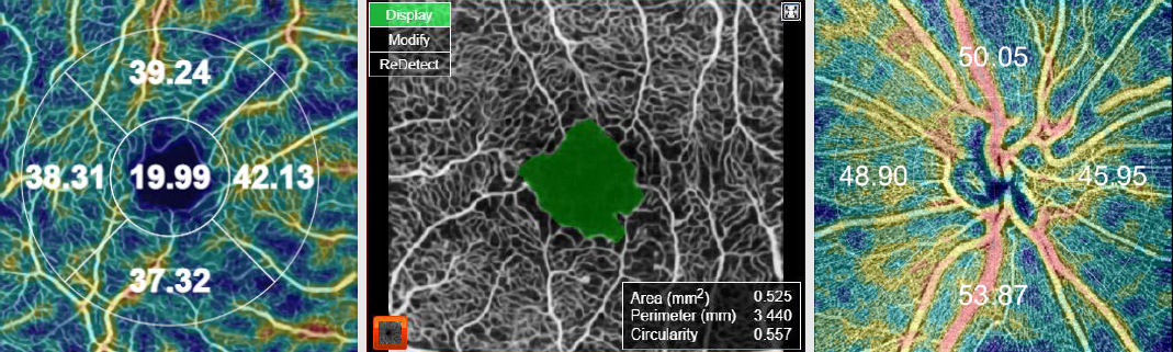 Z algoritmom OCTARA™, lastniškim postopkom za obdelavo slik, omogoča podrobno vizualizacijo žilnih struktur in spremljanje ključnih patologij mrežnice.