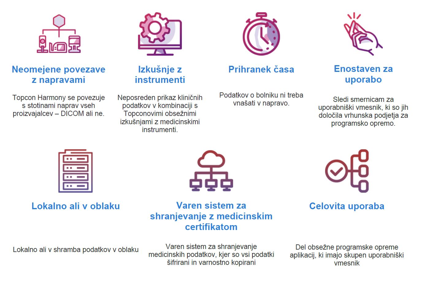 Rešite svoje izzive pri upravljanju podatkov in komunikaciji ter poenostavite potek dela v praksi s programsko aplikacijo Topcon Harmony naslednje generacije. Harmony vam omogoča, da povežete vse svoje diagnostične instrumente, ne glede na proizvajalca, v eno varno spletno platformo, hkrati pa zagotavlja različne funkcije, ki ustrezajo vašim potrebam.