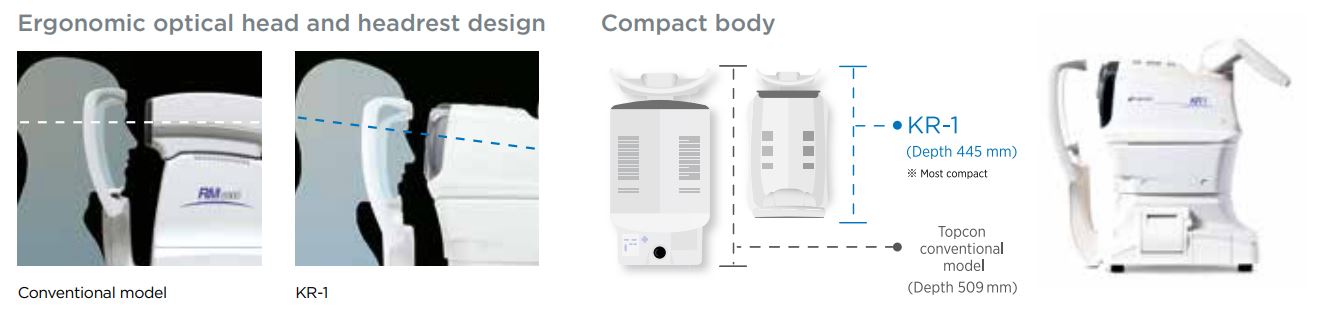 Nova ergonomska oblika KR-1 poskrbi za bolj udoben položaj pacienta s 5° naklonom glave pacienta in optične glave KR-1. Kompaktno telo KR-1 in izboljšana oblika naslona za brado omogočata pacientom lažji dostop. Upravljavec se bo tako laže sporazumeval s pacientom.