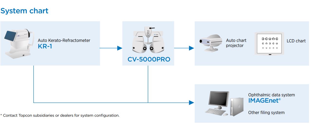 KR-1 je mogoče neposredno povezati z drugimi instrumenti kot je Topcon CV-5000Pro elektronski foropter. KR-1 lahko povežemo v Topconovo slikovno programsko opremo in bazo podatkov: IMAGENet 6 ali Harmony. Ta programska oprema omogoča lažji dostop do podatkov pacienta in je koristno orodje za ohranjanje stikov s strankami.