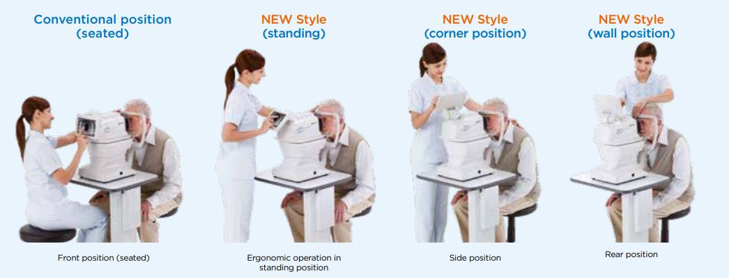 Nastavljiva nadzorna plošča z zaslonom na dotik omogoča upravljavcu, da se postavi kjerkoli v okolici pacienta, saj je nadzorno ploščo mogoče obrniti v številne različne smeri. KR-1 se lahko postavi v običajno namestitev, priti steni pa tudi v kot prostora. kompaktno telo omogoča upravljavcu, da enostavno pregleda pacienta iz različnih položajev tudi takrat, ko morajo biti veke pacienta odprte. Ta edinstveni način omogoča prihranek pri prostoru in prilagajanje tlorisa vaši očesni ordinaciji.