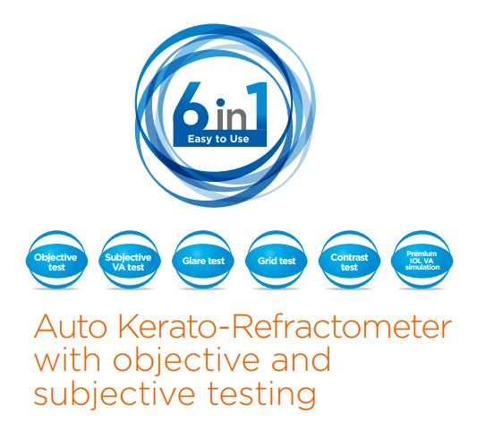 KR-800S je edinstven, saj ne izvaja samo objektivne avto-refrakcije in keratometrije, temveč instrument omogoča subjektivna testiranja na blizu in daleč za pridobitev vrednosti ostrine vida, ter 3 dodatna testiranja, kot so: test bleščanja, kontrastni test in pregled AMD.