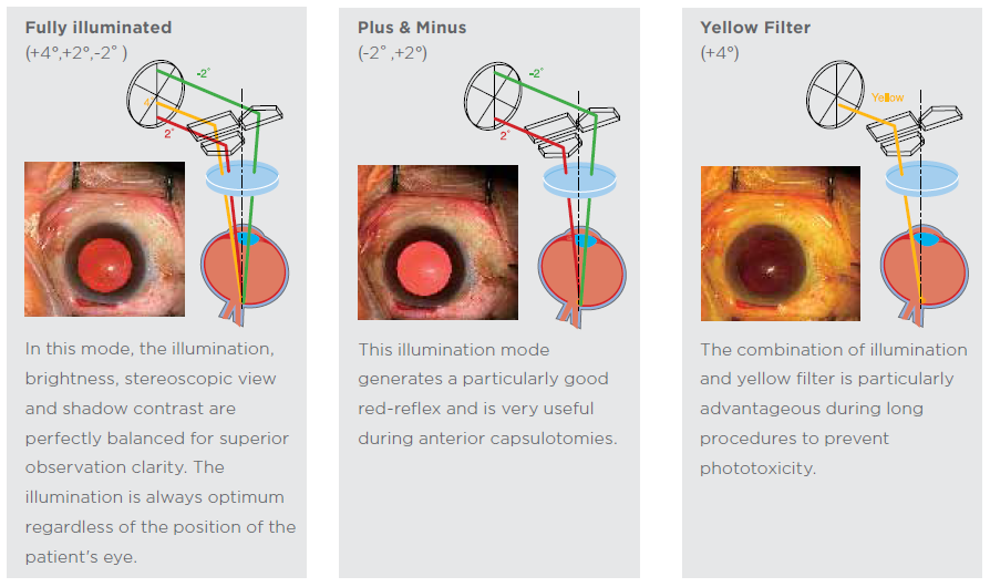 Vrhunsko zasnovana optika zagotavlja optimalno osvetlitev, odpravlja škodljive valovne dolžine in nepotrebno svetlost. Nizka intenzivnost svetlobe prav tako pomaga preprečiti s svetlobo povezane poškodbe mrežničnih tkiv. Integrirani IR filter dodatno zmanjša tveganje fototoksičnosti.