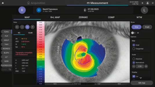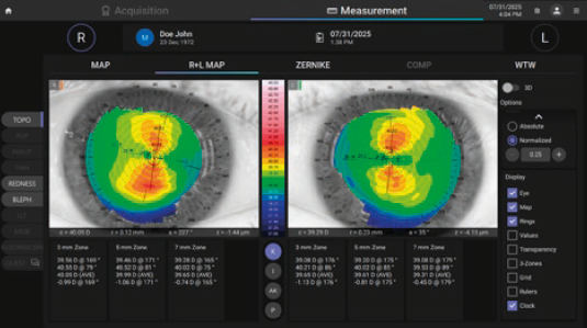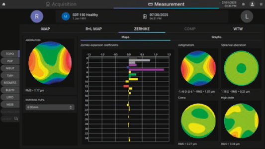 Vključuje aksialne, tangencialne in elevacijske zemljevide ter podatke o keratometriji, simetriji in Zernike analizah, ki podpirajo kirurško načrtovanje ali prileganje kontaktnih leč.