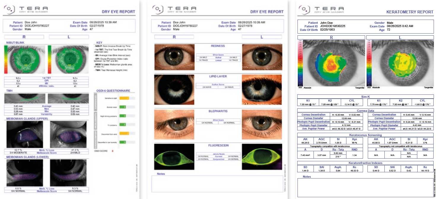 TERA Dry Eye Imager je popoln roženični topograf na osnovi Placido obročev, zasnovan za celovito oceno lastnosti roženice in parametrov zenice. Poleg tega nudi napredna orodja za ocenjevanje, razvrščanje in spremljanje sindroma suhega očesa, skupaj s podrobnimi meritvami sprednje roženične topografije, simuliranih aberacij in pupilografije, ki podpirajo prileganje kontaktnih leč ter diferencialno diagnostiko.