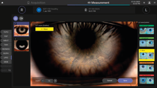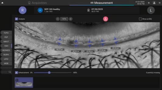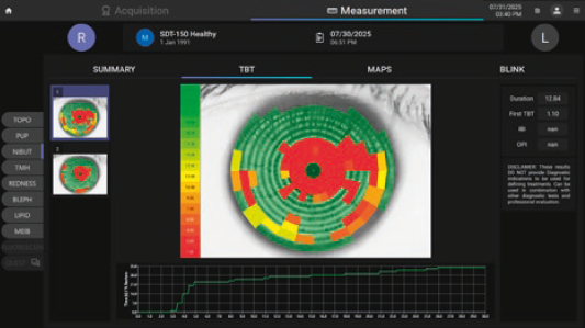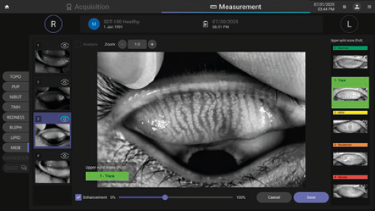 Sistem TERA pomaga strokovnjakom za nego vida prepoznati osnovne vzroke sindroma suhega očesa in bolezni očesne površine. V skladu s priporočili TFOS DEWS III omogoča neinvazivne preglede, kot so višina solznega meniskusa (TMH), neinvazivni čas razpada solznega filma (NIBUT), analiza mežikanja, ocena lipidnega sloja in meibografija – kar podpira osebno prilagojene načrte zdravljenja ter ciljno usmerjene terapevtske odločitve.